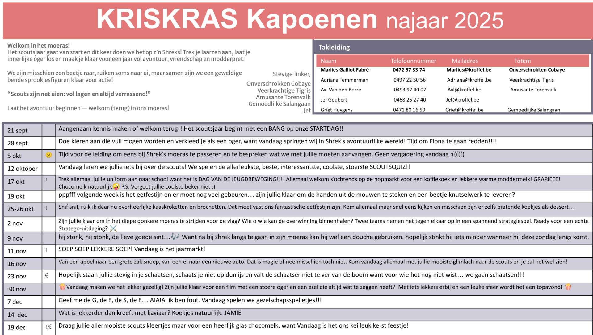 Welkom in het moeras! Het scoutsjaar gaat van start en dit keer doen we het op z'n Shreks! Trek je laarzen aan, laat je innerlijke oger los en maak je klaar voor een jaar vol avontuur, vriendschap en modderpret. We zijn misschien een beetje raar, ruiken soms naar ui, maar samen zijn we een geweldige bende sprookjesfiguren klaar voor actie! "Scouts zijn net uien: vol lagen en altijd verrassend!" Laat het avontuur beginnen — welkom (terug) in ons moeras!
